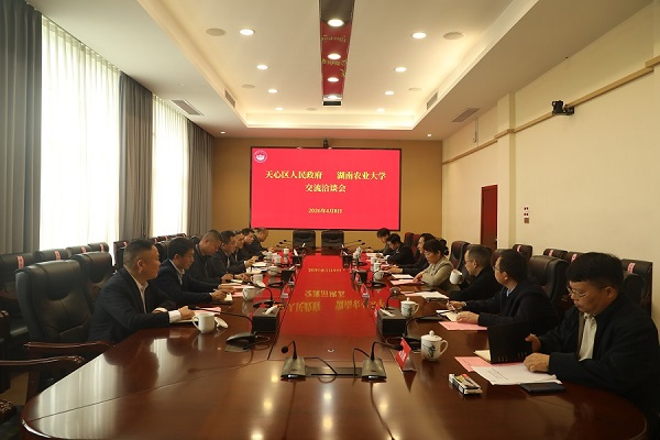 本网讯(社会服务处 裴昌胜)4月8日,长沙市天心区人民政府党组成员、副区长周湛一行到访湖南农业大学。双方围绕深化校地合作、共建长株潭都市乡村示范区等议题展开深入交流。校党委副书记陈光辉出席会议。社会服务处处长朱华武主持会议。